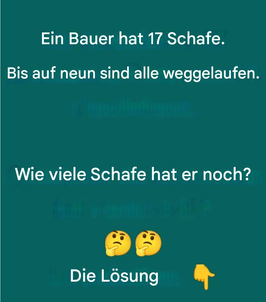 Mathematisches Rätsel: Ein Bauer hat 17 Schafe. Bis auf 9 flohen alle. Wie viele Schafe hat er noch? — ✅ Lösung: Er hat noch 9 Schafe übrig. Erklärung:   Verpassen Sie nicht die Fortsetzung auf der nächsten Seite  siehe Fortsetzung auf der nächsten Seite